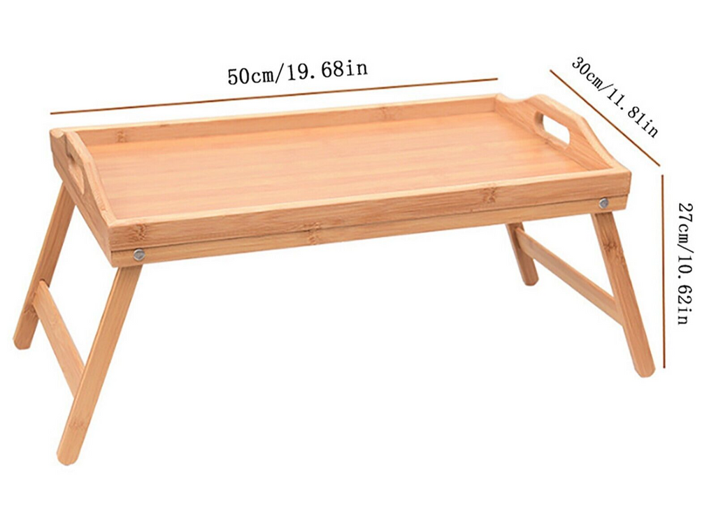 Our foldable tray size is 50 x 30 x 6 cm from edge to edge. This bed tray table has spacious surface that provides ample room for dishes, laptops, or books. Its generous size ensures you have everything you need within reach, enhancing your comfort and convenience.