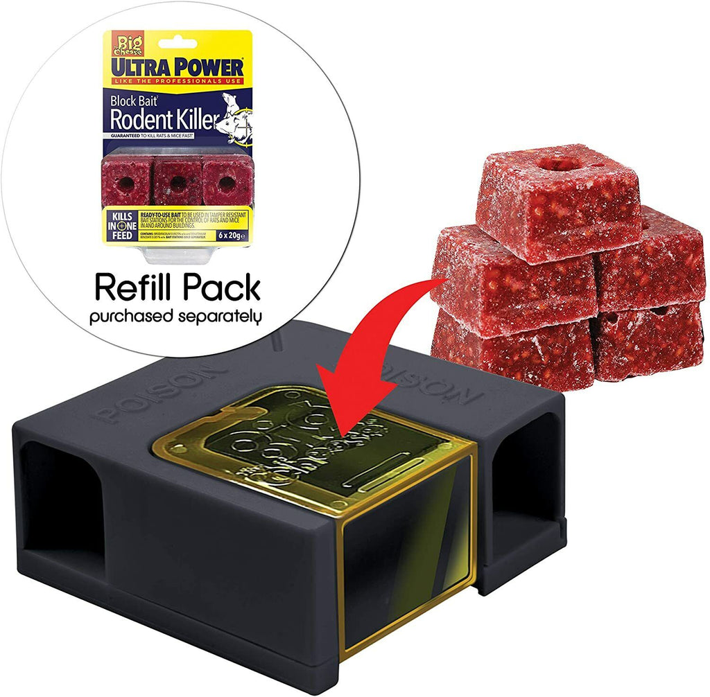 - Refill with The Big Cheese Ultra Power Block Bait Rodent Killer.
