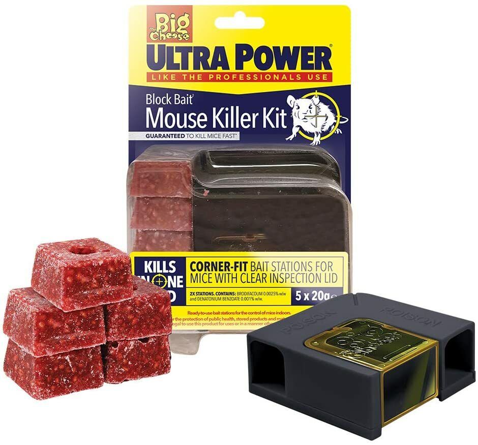 - 2 x corner-fit re-usable mouse bait stations plus 5 x Ultra Power bait blocks with single-feed bait technology.
