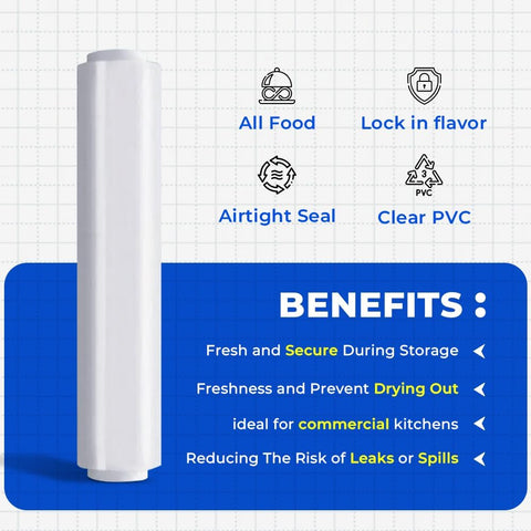 This PVC cling film roll is perfect for keeping food fresh, and protected in both home and catering environments. It provides generous coverage for wrapping sandwiches, sealing leftovers, or covering trays and containers. The strong, flexible film clings tightly to surfaces, helping to lock in freshness while preventing leaks and spills. Ideal for kitchens, restaurants, and events, it is easy to handle and tear for quick, efficient use. Designed for convenience and professional presentation, this cling film is a reliable choice for everyday food storage needs.