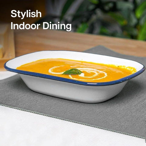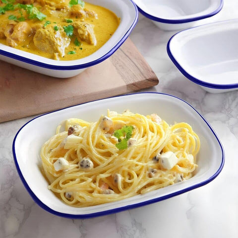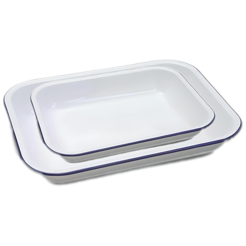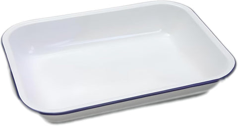 These classic trays have white enamel finish with a bold blue rim, blending vintage charm with modern durability to elevate your kitchen aesthetic. Ideal for baking pies, roasting vegetables, and serving puddings, this dish transitions seamlessly from oven to table. Provides ample depth for generous fillings and a wide edge for creating perfectly crusted pies and puddings.