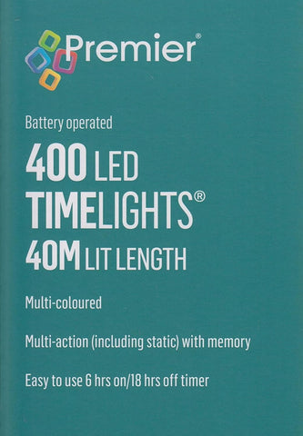 Illuminate your home or garden with festive charm using the Premier 400 LED Multi-Action Battery-Operated Timelights. Perfect for both indoor and outdoor use, these lights come in a variety of stunning color combinations — Vintage Gold/Green Cable, Blue/Green, Rainbow/Green, or White/Warm White/Green Cable — to suit any décor style. Each string boasts 400 energy-efficient LED bulbs, providing a bright, sparkling display that can decorate large trees, garlands, fences, patios, and more.