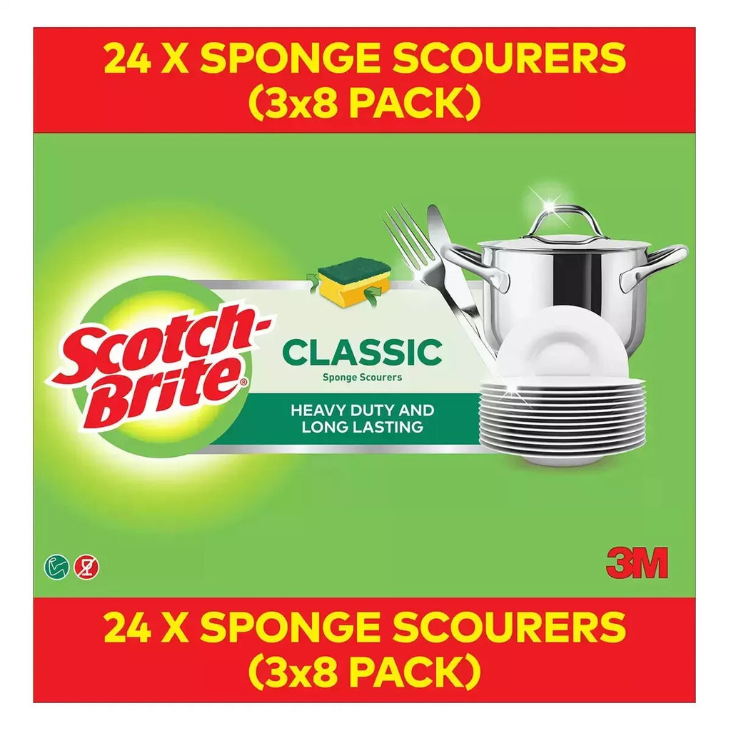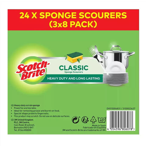 Scotch-Brite® Classic nail-saver is a cleaning tool formed by the combination of a scouring nonwoven and a synthetic foam. The non-woven web is made from high quality synthetic fibers and strong abrasive particles, all bonded together by means of a durable resin. It is laminated to a synthetic foam, grooved to obtain its characteristic final shape. Scotch-Brite scourers are crafted with durable materials and an abrasive surface, making them highly effective in tackling tough stains and grime. Ideal for use on various surfaces, from cookware and dishes to countertops and appliances, Scotch-Brite scourers are versatile and reliable. With 24 scourers in one pack, you'll be well-equipped for everyday cleaning tasks, ensuring lasting value and convenience.
